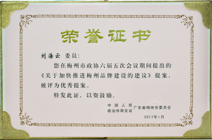 2017年1月9日,中國人民政治協(xié)商會(huì)議第七屆廣東省梅州市委員會(huì)第一次會(huì)議勝利召開,建藝集團(tuán)董事長劉海云作為六屆政協(xié)委員參加七屆一次會(huì)議,并光榮當(dāng)選新一屆政協(xié)常委和提案委員會(huì)委員。同時(shí),劉海云董事長在2016年度政協(xié)提案《關(guān)于加快推進(jìn)梅州品牌建設(shè)的建議》被評為優(yōu)秀提案,在會(huì)上獲得了表彰,劉海云董事長登臺(tái)領(lǐng)取了榮譽(yù)證書。