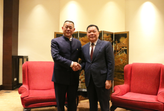 建藝集團(tuán)董事長(zhǎng)兼總裁劉海云(右)與天基權(quán)集團(tuán)董事長(zhǎng)釋延豹合影