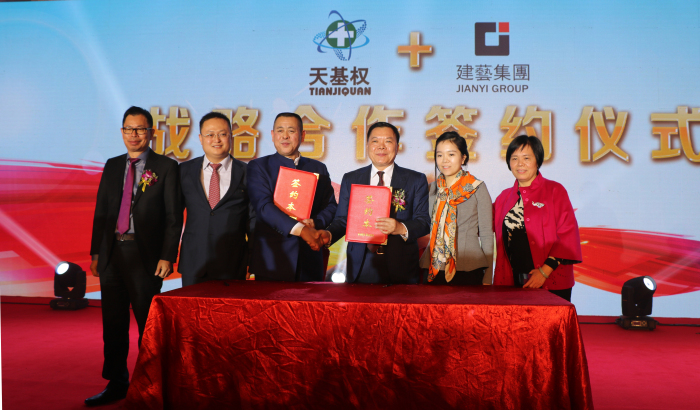 2017年1月21日,在深圳天基權(quán)健康科技集團(tuán)股份有限公司15周年慶典會(huì)上,建藝集團(tuán)董事長(zhǎng)兼總裁劉海云與天基權(quán)集團(tuán)董事長(zhǎng)釋延豹分別代表雙方企業(yè)簽署戰(zhàn)略合作協(xié)議,掀開“建藝”“天基權(quán)”強(qiáng)強(qiáng)聯(lián)合、共贏未來的嶄新篇章。簽約后,建藝集團(tuán)董事長(zhǎng)兼總裁劉海云上臺(tái)發(fā)言,表示建藝集團(tuán)和天基權(quán)集團(tuán)此次的強(qiáng)強(qiáng)聯(lián)合,一定能讓天基權(quán)借助資本市場(chǎng)的力量為人類健康貢獻(xiàn)更大的力量,同時(shí)也為雙方后續(xù)更加深入、全面的戰(zhàn)略合作打下堅(jiān)實(shí)根基,并為建藝集團(tuán)未來的戰(zhàn)略產(chǎn)業(yè)布局架設(shè)更寬廣的橋梁。建藝集團(tuán)董事、副總裁顏如珍,建藝集團(tuán)董事、副總裁孫昀,建藝集團(tuán)副董事長(zhǎng)劉珊等出席周年慶典活動(dòng)并見證了雙方締結(jié)戰(zhàn)略合作這一重要時(shí)刻。