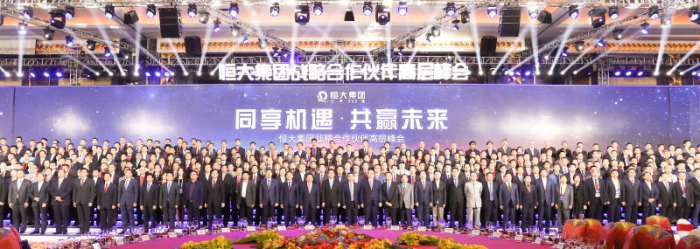 劉海云董事長(zhǎng)等與會(huì)企業(yè)領(lǐng)導(dǎo)與許家印主席等恒大高管在峰會(huì)上合影