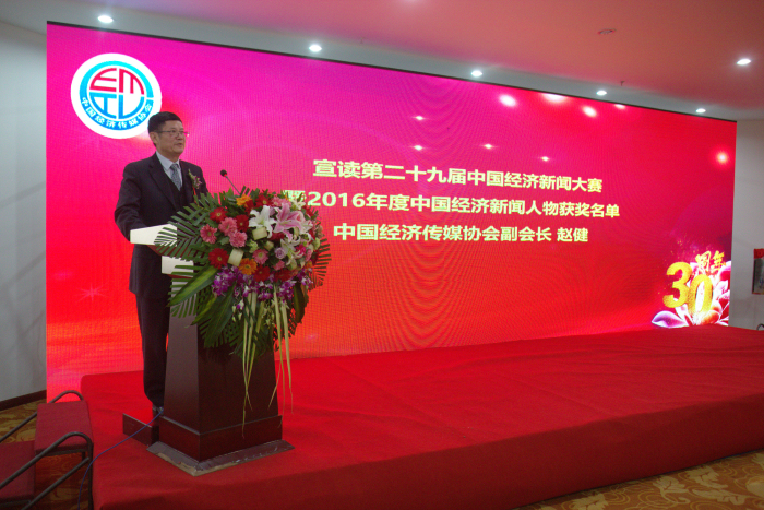 中國(guó)經(jīng)濟(jì)傳媒協(xié)會(huì)副會(huì)長(zhǎng)趙健宣讀第二十九屆中國(guó)經(jīng)濟(jì)新聞大賽暨2016年度中國(guó)經(jīng)濟(jì)新聞人物獲獎(jiǎng)名單