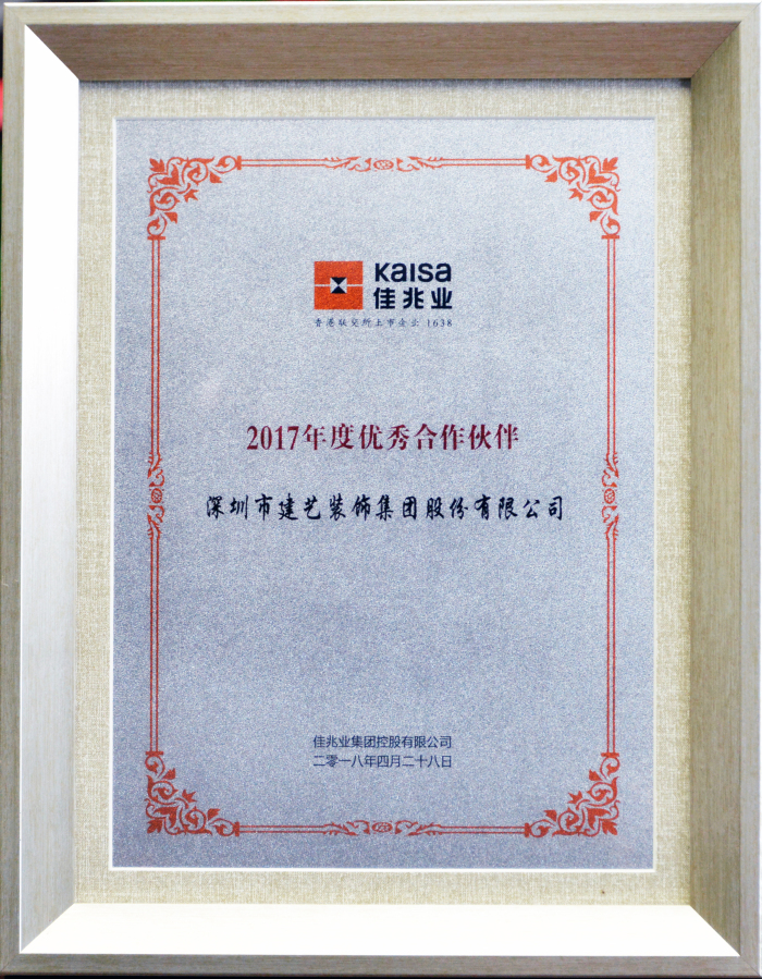 開創(chuàng)新時代的良好發(fā)展格局,離不開合作伙伴的匠心精神。本著公平公正的原則,佳兆業(yè)集團對所有合作伙伴進(jìn)行嚴(yán)格評估,峰會現(xiàn)場頒發(fā)了“2017年度優(yōu)秀合作伙伴”等五大獎項,以表彰2017年度在品質(zhì)、設(shè)計、服務(wù)、貢獻(xiàn)、長期合作等方面做出杰出貢獻(xiàn)的合作伙伴及優(yōu)秀個人。建藝集團憑借卓越的合作表現(xiàn)及長期以來對品質(zhì)的無懈追求,榮獲“2017年度優(yōu)秀合作伙伴”獎。