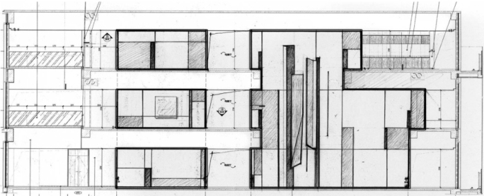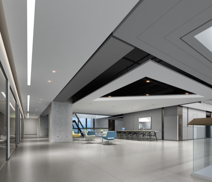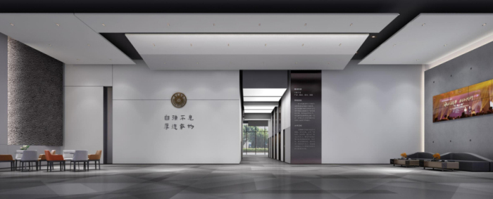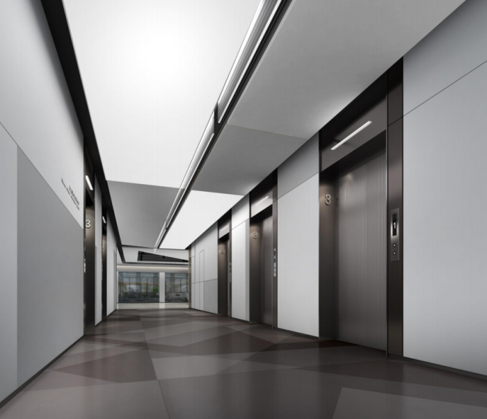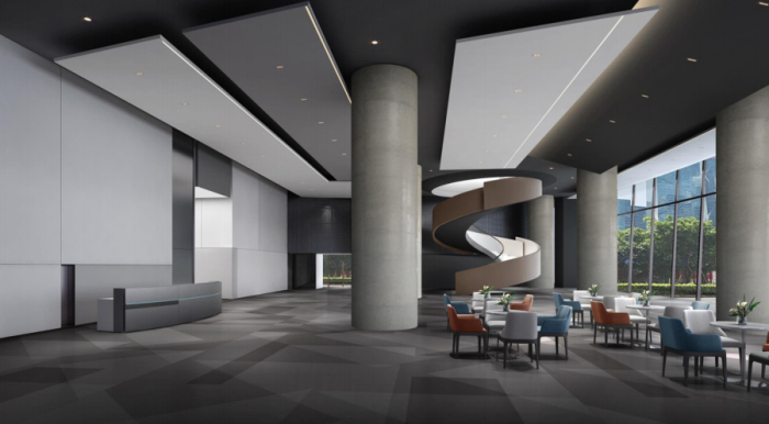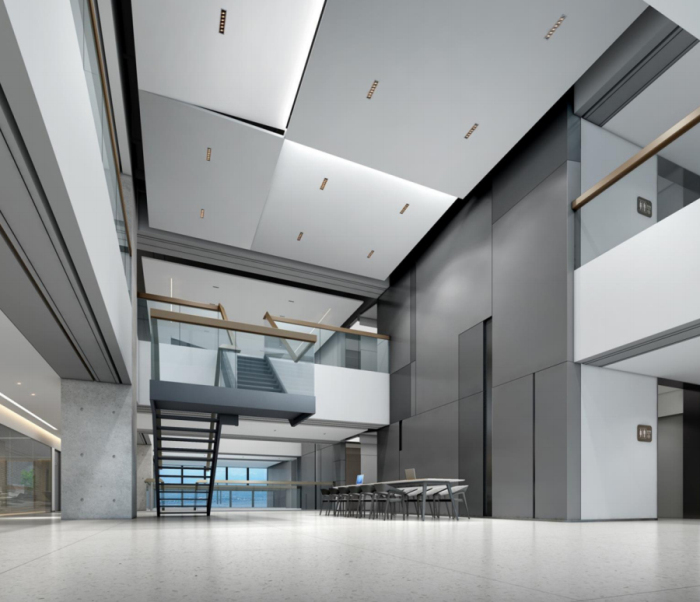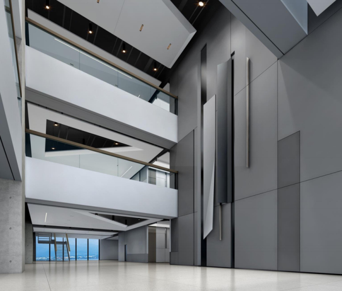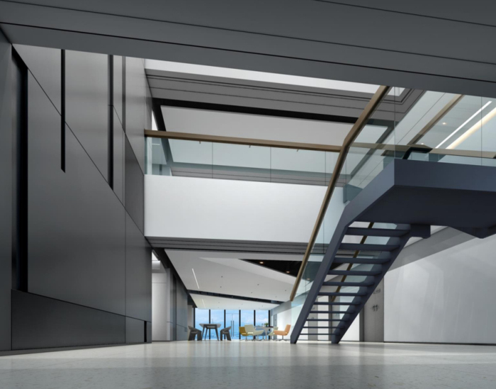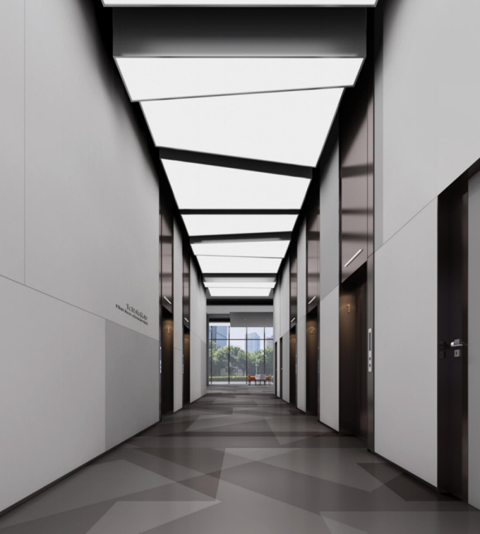 二至四層大廳主立面:中灰度分色墻面,深色凹槽、錯落有致的線條分割,干凈利落、簡約現(xiàn)代,增添了空間的厚實感、設(shè)計感、藝術(shù)感、秩序感、工業(yè)感,嚴(yán)謹(jǐn)?shù)脑O(shè)計手法既新穎又現(xiàn)代。