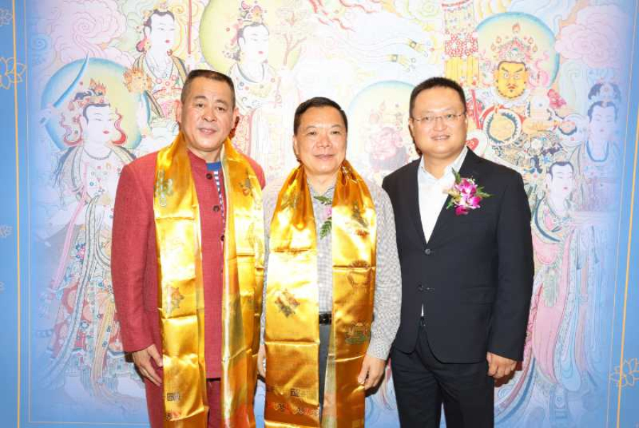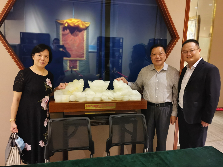 劉海云及顏如珍董事、孫昀董事在建藝集團(tuán)贈(zèng)送天基權(quán)集團(tuán)的伊朗紅花冰玉雕前合影