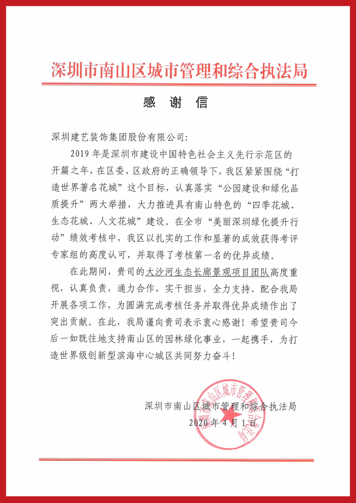 在得知深圳市開展“美麗深圳綠化提升行動”績效考核后,建藝集團大沙河生態(tài)長廊景觀項目團隊高度重視,并全力配合、協(xié)助南山區(qū)城市管理和綜合執(zhí)法局開展各項相關工作,最終助力區(qū)城管局圓滿完成考核任務并取得考核第一名的優(yōu)異成績。