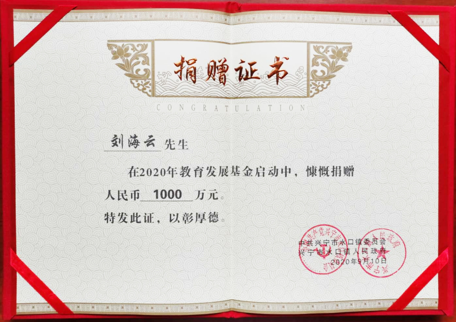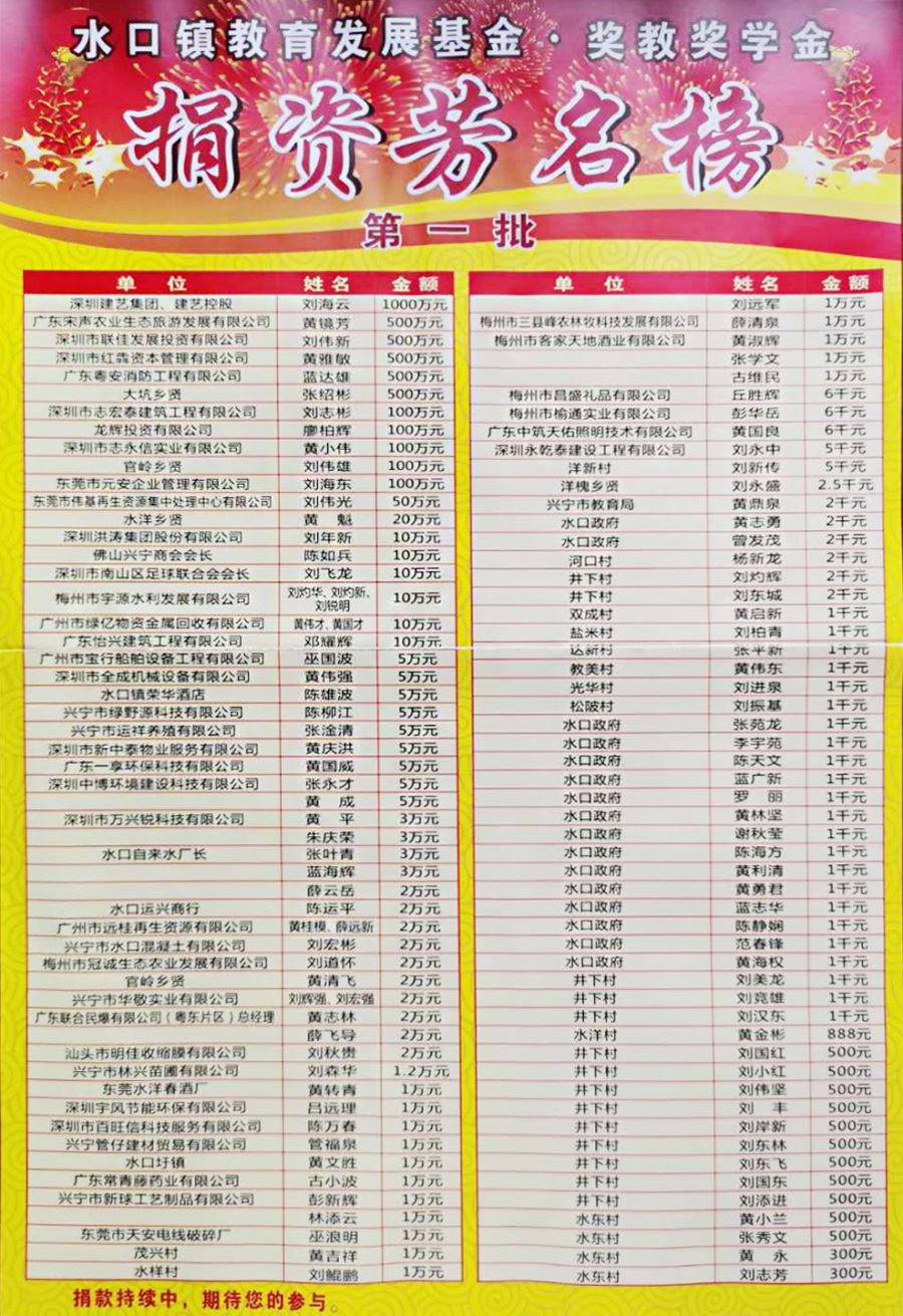 昨日,是第36個(gè)教師節(jié)。作為“廣東省教育強(qiáng)鎮(zhèn)”,興寧市水口鎮(zhèn)特別發(fā)布“表彰芳名榜”,向在2020年教育發(fā)展基金啟動(dòng)中慷慨捐贈(zèng)(認(rèn)捐)善款的廣大愛(ài)心鄉(xiāng)賢人士致謝。建藝集團(tuán)、建藝控股董事會(huì)主席劉海云以身作則,首批響應(yīng)家鄉(xiāng)號(hào)召,帶頭認(rèn)捐1000萬(wàn)元善款!這也是自2017年捐助水口中學(xué)教育強(qiáng)市200萬(wàn)元后,劉海云又一次為家鄉(xiāng)教育事業(yè)發(fā)展傾注愛(ài)心。