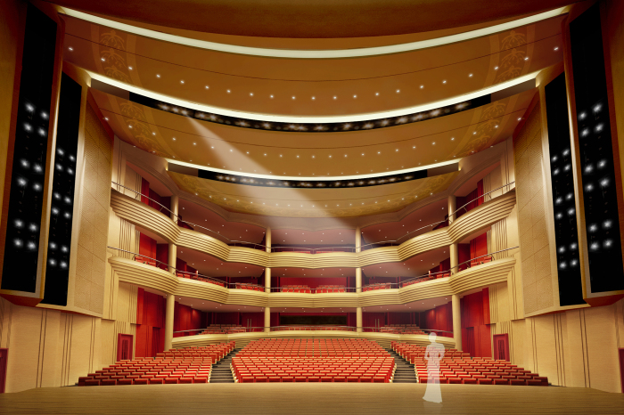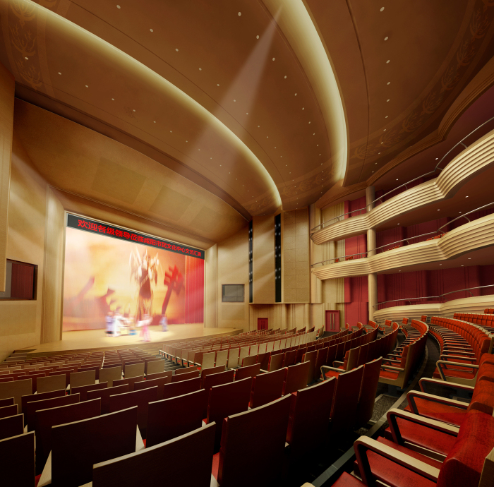 其觀眾廳天花設(shè)計(jì)為貫通的兩道面光的傳統(tǒng)模式,不但滿足了面光數(shù)量和角度的要求,呈階梯狀的弧面天花造型對(duì)聲音的傳播起到很好的擴(kuò)散作用,讓直達(dá)聲更多的到達(dá)觀眾席。天花避免單調(diào)的平頂造型,設(shè)計(jì)簡(jiǎn)單的凹縫處理,內(nèi)嵌造型紋樣,取自秦文化的玄鳥圖騰。耳光室兩側(cè)位置設(shè)計(jì)回形紋樣造型,也是作為獨(dú)特藝術(shù)可識(shí)性的體現(xiàn)。把使用功能放在第一位,同時(shí)增加相關(guān)地域文化元素,讓整體達(dá)到經(jīng)濟(jì)實(shí)用目的,同時(shí)含蓄的體現(xiàn)了秦文化內(nèi)涵。