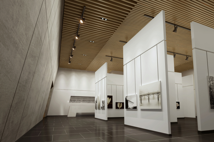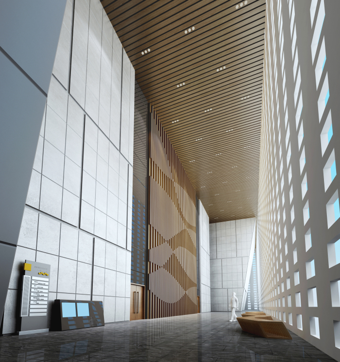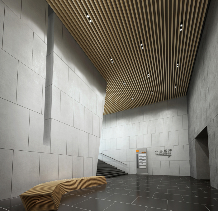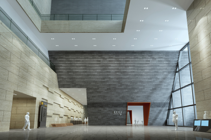 劇院入門大廳設(shè)計(jì)延續(xù)建筑設(shè)計(jì)手法,將建筑外觀元素進(jìn)行深化、細(xì)化及組合,形成豐富變化。將城墻磚的體塊感、灰紅對(duì)比等方式體現(xiàn)出歷史厚重感以及中華燦爛文化的親和力。墻面利用統(tǒng)一的米黃色洞石工字縫拼接,加強(qiáng)了空間的統(tǒng)一性與整體感。在材質(zhì)、造型、比例、色彩、照明等室內(nèi)設(shè)計(jì)多種元素上,注重相互關(guān)系與空間協(xié)調(diào)感。