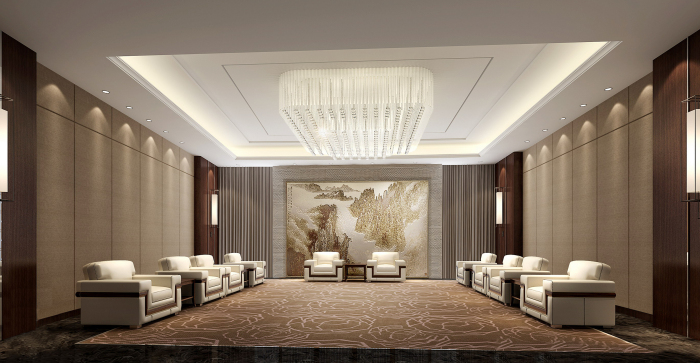 VIP接待室布局大氣,設(shè)施完善。主背景墻掛畫選擇秦文化相關(guān)藝術(shù)畫作,一圈的回字紋延續(xù)其他空間設(shè)計(jì)元素。整體表現(xiàn)高貴而雅致,充分滿足接待休息使用要求。