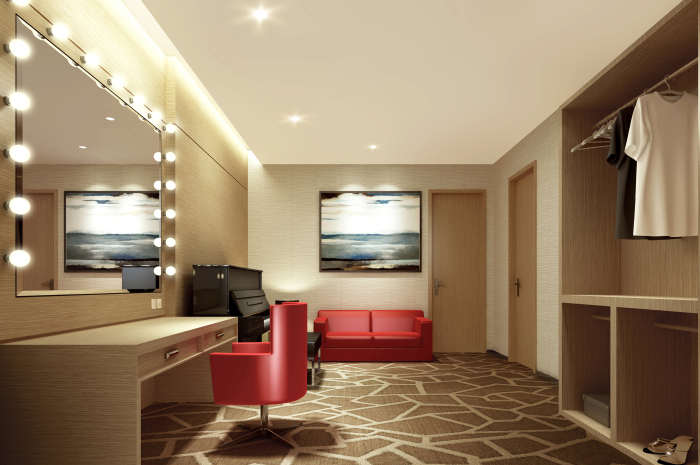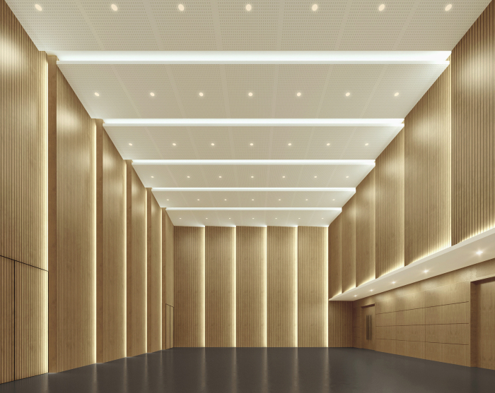 排練廳設(shè)計(jì)中,材料的統(tǒng)一強(qiáng)調(diào)空間的縱深感,墻面硬包的處理增加吸聲面積。天花與墻面融為一體,流動(dòng)的線條與節(jié)奏韻律感相呼應(yīng)。