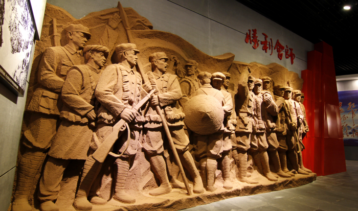 紅軍過雪山的立體墻面,近處幾個(gè)紅軍戰(zhàn)士正在行軍中,仿佛要走出來一般,顯得非常逼真,栩栩如生;遠(yuǎn)處則是大部隊(duì)人馬正在翻越雪山的情景。
