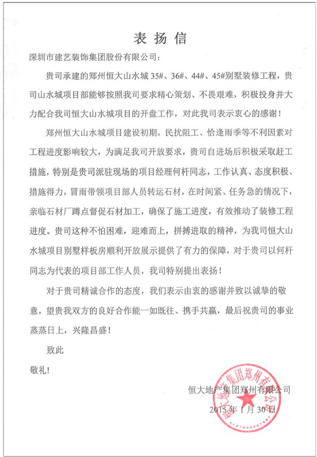 建藝集團(tuán)鄭州恒大山水城項(xiàng)目部獲得業(yè)主方高度表彰