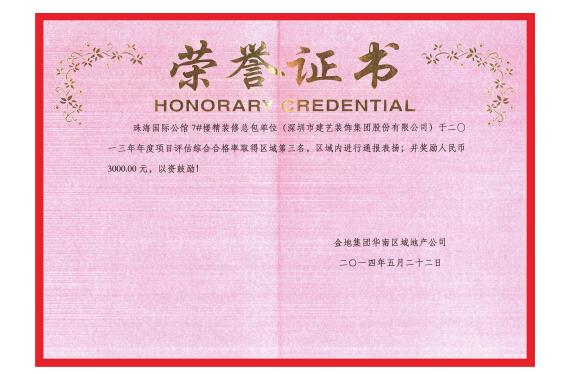 建藝集團喜獲金地集團“2013年度項目評估綜合合格率區(qū)域第三名”榮譽