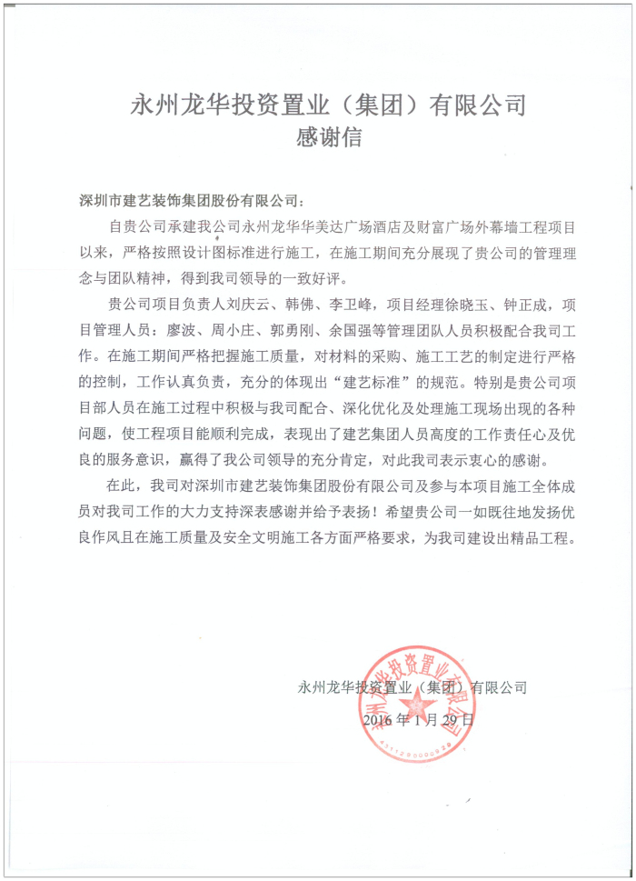 關(guān)于永州龍華華美達廣場酒店及財富廣場外幕墻工程的表揚信