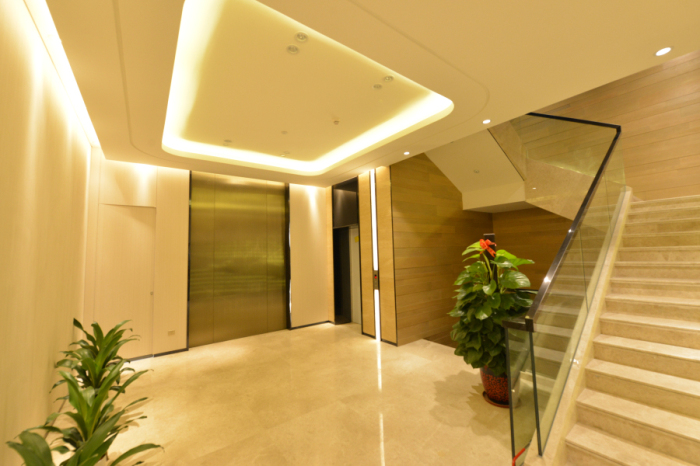 在建藝集團項目人員的精心施工下,此項目的最終完成效果可謂是非常驚艷。前臺接待大廳全部采用西班牙米黃大理石,鑲嵌上紅色大字“華耀城”,顯得分外耀眼。為了實現(xiàn)設計要求的特殊紋路藝術效果,建藝集團項目人員對墻面石材板塊進行了人工琢打加工,使用專用于石材荔枝面處理的氣動荔枝錘進行敲打,精雕細琢,使原本較為光滑的雕刻面呈現(xiàn)出自然的波浪形紋路效果,每一塊石材都獨一無二。