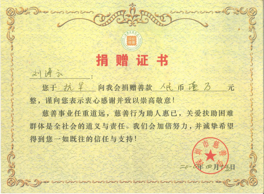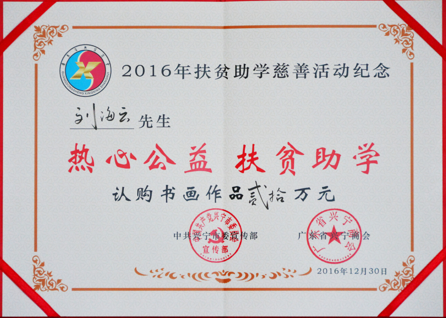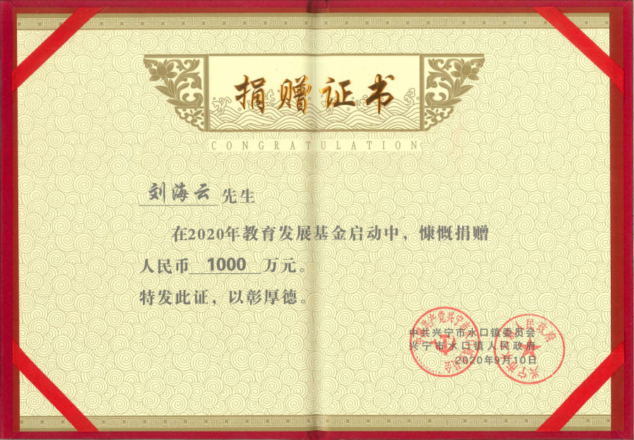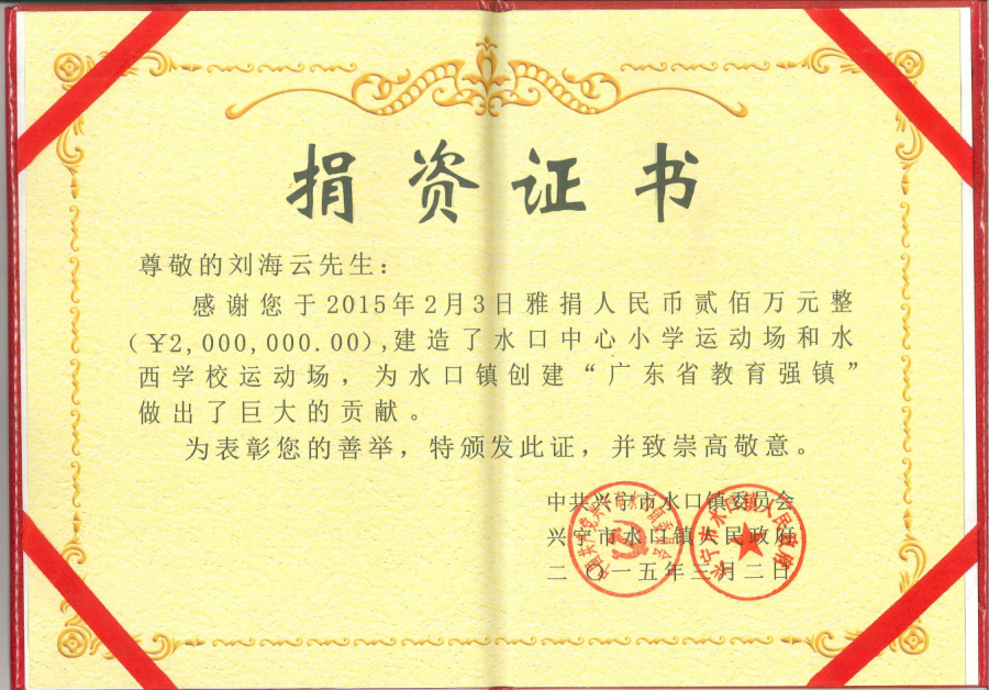 在2019年度“廣東扶貧濟(jì)困日”活動中,劉海云向平遠(yuǎn)縣仁居鎮(zhèn)捐贈善款100萬元,用于支持當(dāng)?shù)氐缆窐蛄航ㄔO(shè);廣東興寧水口鎮(zhèn)洋新村老人活動中心新農(nóng)村建設(shè)共捐贈900多萬元;廣東平遠(yuǎn)縣扶貧助學(xué)捐助270萬元;廣東興寧教育強(qiáng)市捐助200萬元;廣東興寧公益慈善共捐630萬元;廣東平遠(yuǎn)縣發(fā)展教育基金會成立暨捐贈儀式上向基金會捐贈800萬元;廣東興寧市水口鎮(zhèn)2020年教育發(fā)展基金啟動中帶頭認(rèn)捐1000萬元……