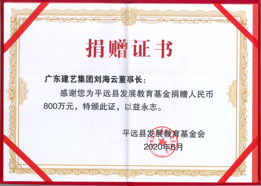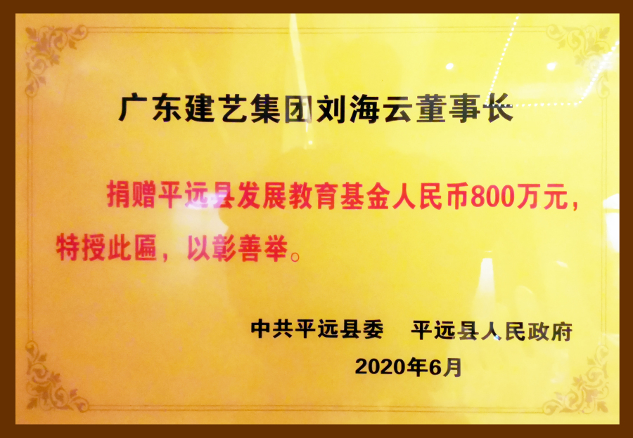 從1994年成立至今,作為廣東企業(yè)500強(qiáng)的建藝集團(tuán),始終把“以德為先,誠信為本,構(gòu)筑精品為目標(biāo)”的企業(yè)宗旨體現(xiàn)在促進(jìn)國家、民族與社會的繁榮進(jìn)步之中。董事會主席劉海云更是以身作則,堅(jiān)持用大愛回饋社會,累計捐資數(shù)千萬元,為大批貧困地區(qū)提供支持,極大促進(jìn)了當(dāng)?shù)亟逃?、醫(yī)療、民生等事業(yè)的進(jìn)步發(fā)展。