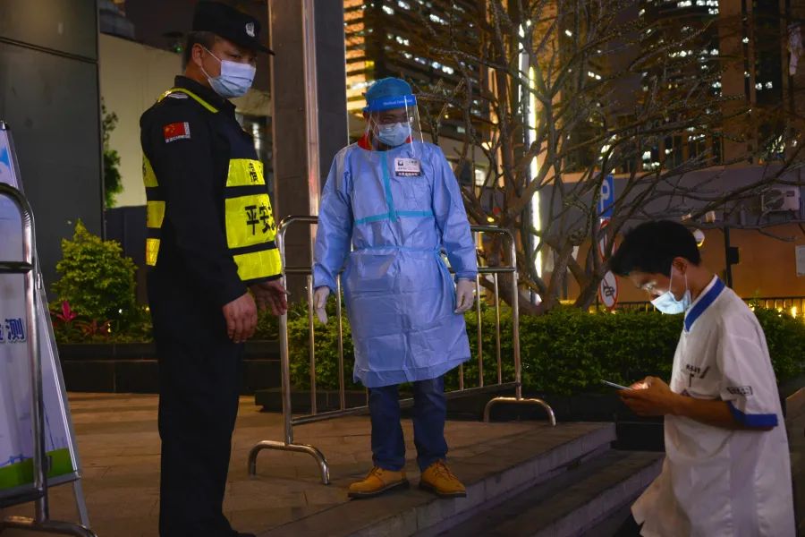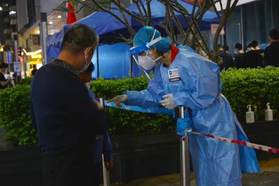 組圖:夜幕降臨,李媛娣(左)等建藝志愿者在核酸檢測(cè)點(diǎn)持續(xù)服務(wù)