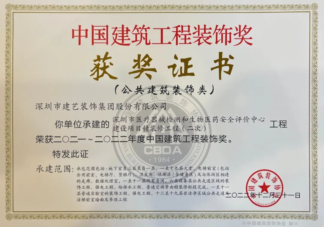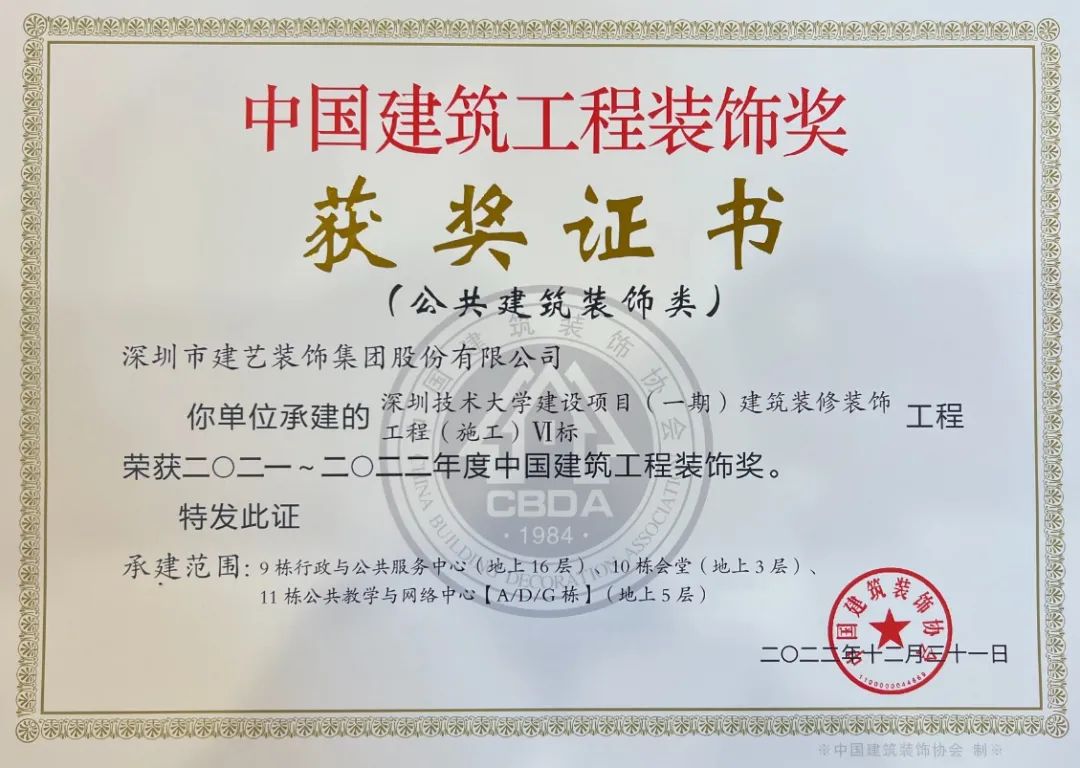 3月23日,由建藝集團(tuán)參建的深圳技術(shù)大學(xué)(一期)建筑裝修裝飾工程Ⅵ標(biāo)段(簡稱深圳技術(shù)大學(xué)項(xiàng)目)和深圳市醫(yī)療器械檢測和生物醫(yī)藥安全評價(jià)中心項(xiàng)目(簡稱深圳藥檢大廈項(xiàng)目)再獲殊榮,榮獲由中國建筑裝飾協(xié)會評選頒發(fā)的全國建筑裝飾行業(yè)最高榮譽(yù)獎項(xiàng)——“中國建筑工程裝飾獎”。