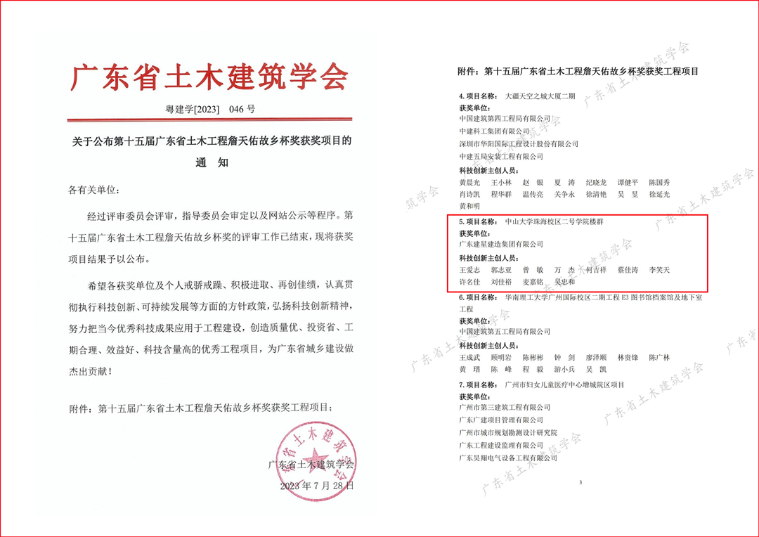 近日,“2023年廣東省土木建筑工程技術(shù)創(chuàng)新交流及成果展示會”在廣州召開。建藝集團控股子公司建星集團承建項目中山大學(xué)珠海校區(qū)二號學(xué)院樓群再獲第十五屆廣東省土木工程“詹天佑故鄉(xiāng)杯”獎,集團榮譽又添碩果。