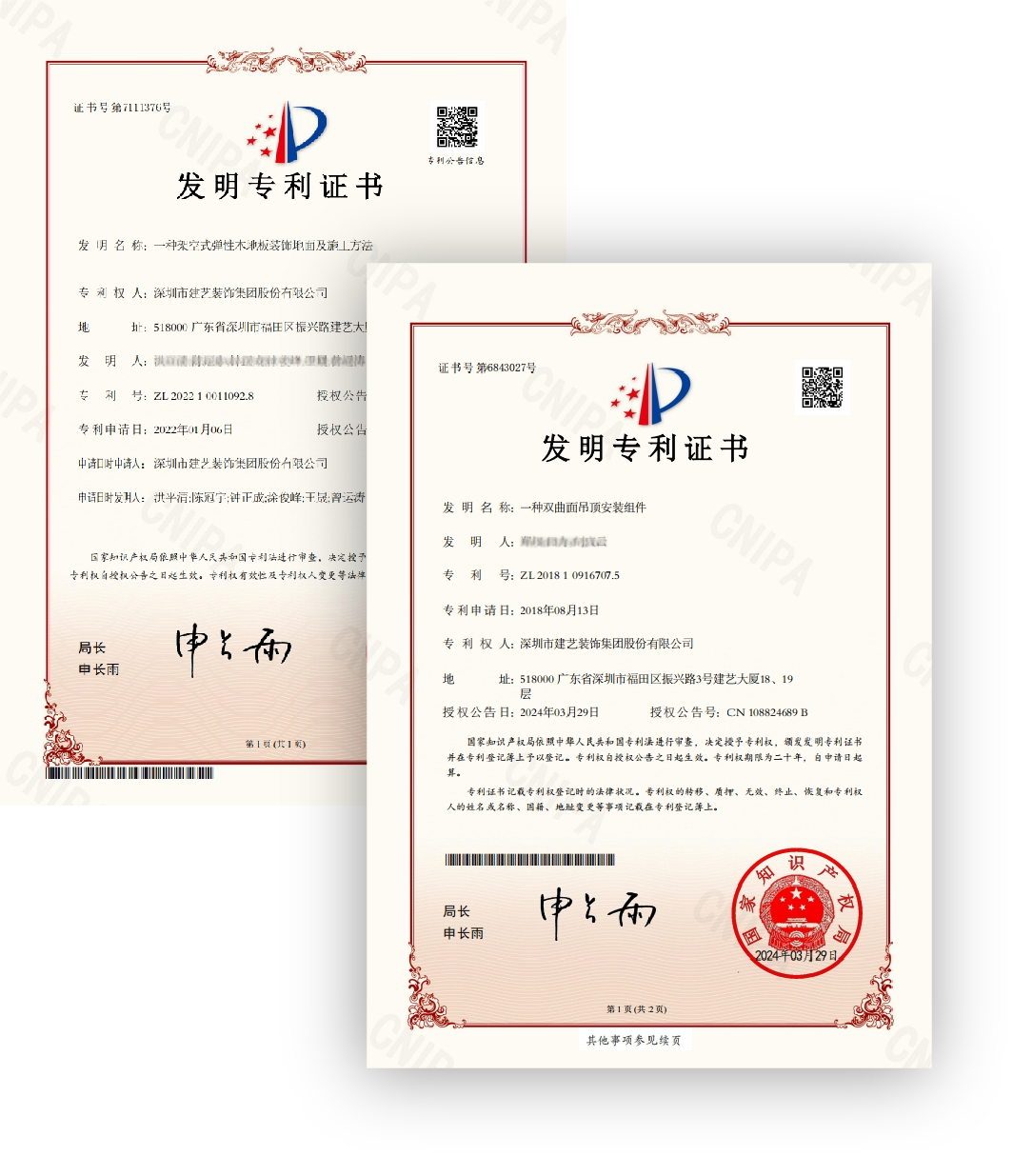 近日,建藝集團創(chuàng)新研發(fā)的“一種雙曲面吊頂安裝組件” “一種架空式彈性木地板裝飾地面及施工方法” “一種便于安裝的裝飾天花板”“一種具有吸音功能的室內(nèi)墻板” “一種新型玻璃幕墻安裝結(jié)構(gòu)”等7項發(fā)明專利和實用新型專利再次獲得國家知識產(chǎn)權(quán)局授權(quán)。