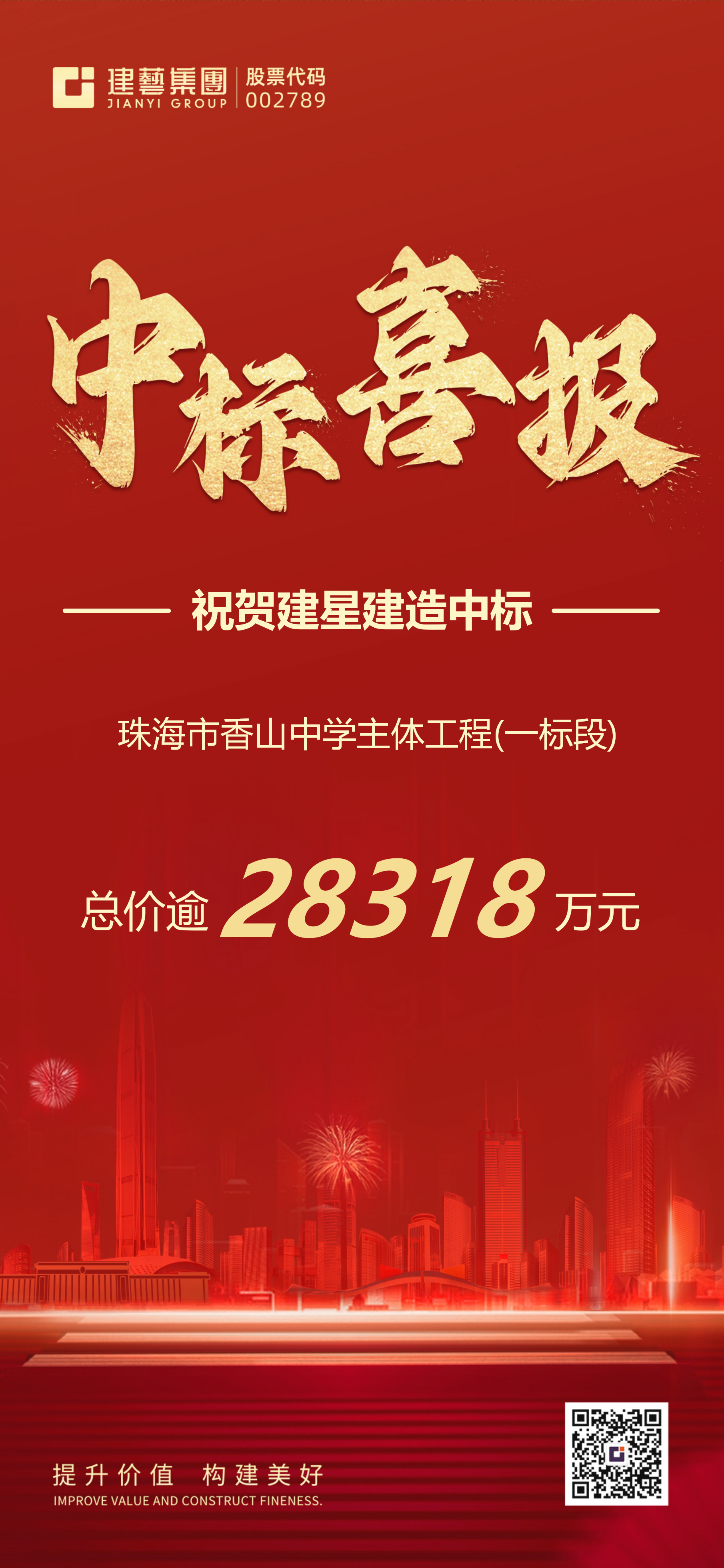 近日,深圳市建藝裝飾集團股份有限公司旗下子公司廣東建星建造集團有限公司喜獲中標:珠海市香山中學主體工程(一標段),總價逾2.83億元。