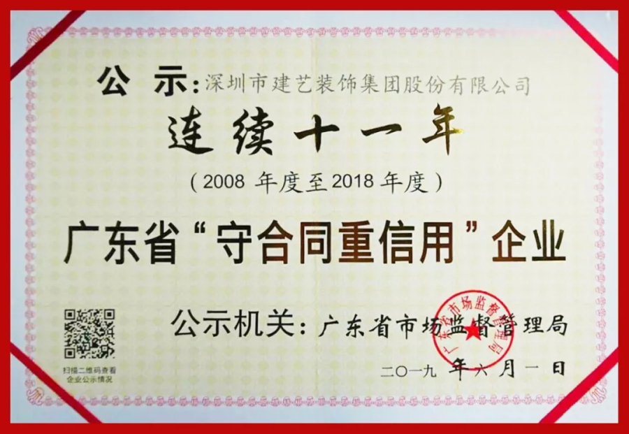 建藝集團連續(xù)11年榮獲廣東省“守合同重信用”企業(yè)榮譽稱號