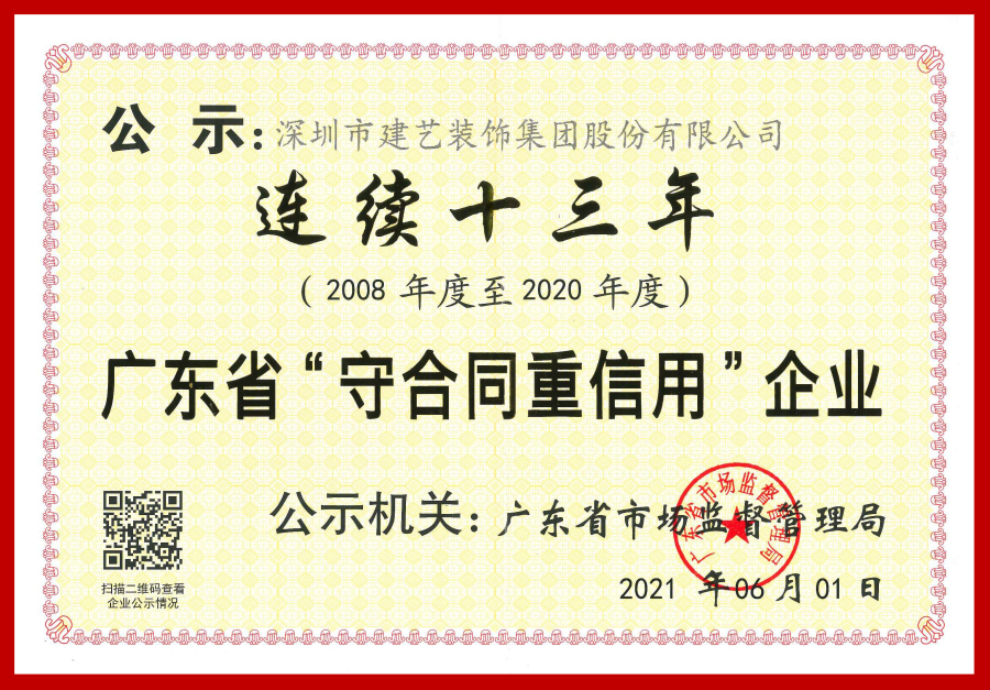 2021年,建藝集團(tuán)憑借自身良好的信用體系建設(shè)及誠(chéng)信守約形象再次獲得社會(huì)肯定,連續(xù)十三年榮獲廣東省“守合同重信用”企業(yè)稱號(hào)!