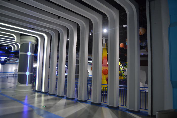 建藝集團(tuán)承建了“夢東方?未來世界”航天主題樂園1.5層和2層的精裝修。天花采用鋁方通吊頂,吊頂結(jié)構(gòu)與燈光、航空展覽設(shè)備完美結(jié)合,營造出魔幻的航天科技視覺體驗(yàn)環(huán)境。照明系統(tǒng)用于航天主題展館燈光照射,會(huì)帶給觀眾奇妙的視覺體驗(yàn),這對用電系統(tǒng)的安裝、使用、維修提出了很高的要求,對燈光效果更是嚴(yán)格,主要是各類主題展館照明效果要顯示其特殊的功能和感官效果。因此,在工程施工中,建藝集團(tuán)工程人員進(jìn)行了認(rèn)真細(xì)致的深化圖紙?jiān)O(shè)計(jì),并對照明設(shè)備、燈具等進(jìn)行嚴(yán)格篩選,反復(fù)試驗(yàn),有效完成了項(xiàng)目的施工管理目標(biāo)。