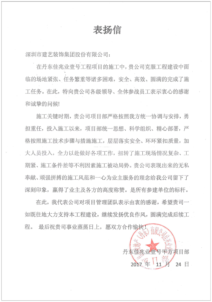 建藝集團項目部榮獲的表揚信