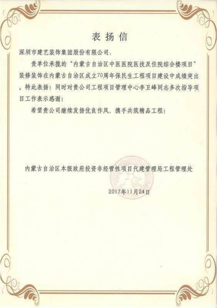 近日,由建藝集團(tuán)承建的內(nèi)蒙古自治區(qū)中醫(yī)醫(yī)院醫(yī)技及住院綜合樓項(xiàng)目裝飾裝修工程順利交付。該項(xiàng)目作為內(nèi)蒙古自治區(qū)成立70周年保民生建設(shè)項(xiàng)目,我司在該項(xiàng)目建設(shè)過(guò)程中憑借精湛的施工技藝及優(yōu)秀的項(xiàng)目管理,被內(nèi)蒙古自治區(qū)本級(jí)政府投資非經(jīng)營(yíng)性項(xiàng)目代建管理局評(píng)為優(yōu)秀施工單位。同時(shí),工程管理中心李衛(wèi)鋒在項(xiàng)目建設(shè)過(guò)程中,充分發(fā)揚(yáng)了建藝人求真務(wù)實(shí)、盡職盡責(zé)的優(yōu)良作風(fēng),獲得內(nèi)蒙古自治區(qū)本級(jí)政府投資非經(jīng)營(yíng)性項(xiàng)目代建管理局的通報(bào)表?yè)P(yáng)。