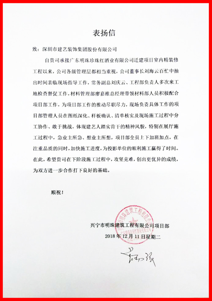 廣東明珠珍珠紅酒業(yè)有限公司遷建項目建藝團隊獲表彰