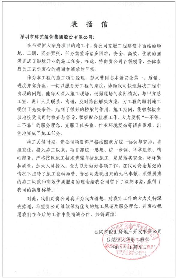 我司承建的山西呂梁恒大華府影劇院項目,在面臨前期相關方進度嚴重滯后等嚴峻挑戰(zhàn)時,項目部工程人員克服種種困難,不怕苦,不怕累,精心組織,科學安排,全力沖刺,全力配合,最終憑借努力付出,達到了業(yè)主方的進度目標要求,確保了影劇院準時開業(yè)。業(yè)主方對我司工程人員的高超管理水平以及對項目工作的高度負責任精神表示極大認同,對我司在該項目上所做出的巨大努力和突出表現表示了高度贊揚!