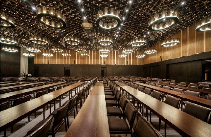 三層宴會(huì)廳極具特色。宴會(huì)廳約八百平方米,墻面下半部分是深咖啡色的平板木飾面,上半部分是淺咖啡色的扇形疊級(jí)造型,每塊板之間暗藏著LED燈帶滿足了照明和裝飾的雙重效果。玫瑰金不銹鋼菱形拼花鏤空天花造型國內(nèi)獨(dú)一無二,再加上高達(dá)八米的層高,使整個(gè)宴會(huì)廳莊重大氣。