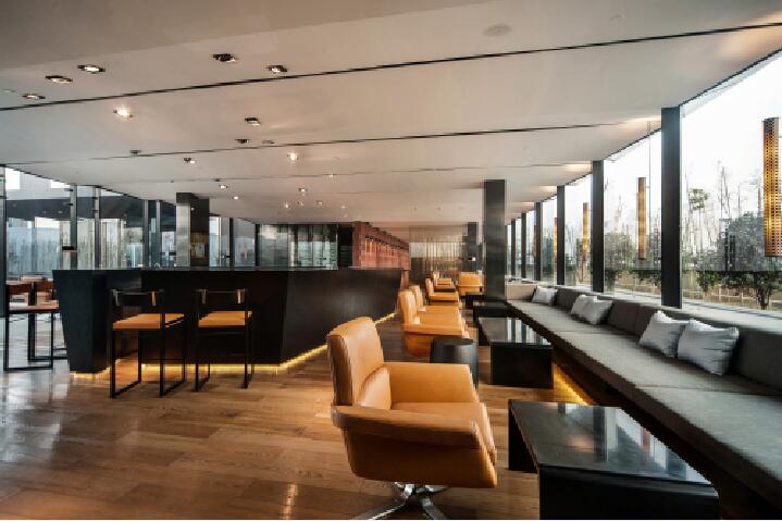 二層與中空大堂相鄰的休息廳中,四十米長(zhǎng)、四米高的巨型木制鏤空花格折疊屏風(fēng),既是裝飾又把休息廳與大堂朦朧的分割開來,隱約可見。兩側(cè)墻面選用了中國古老的算盤珠制作的造型,貫穿著簡(jiǎn)約中式的設(shè)計(jì)美感。
