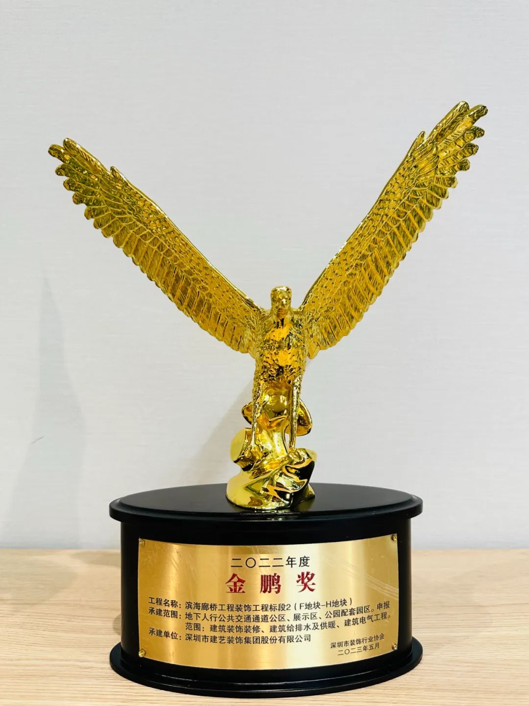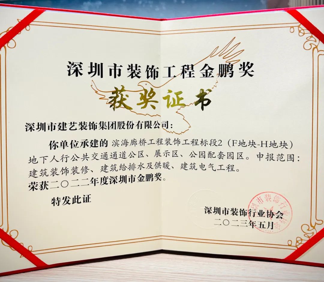近日,由深圳市裝飾行業(yè)協(xié)會(huì)主辦的深圳市裝飾工程金鵬獎(jiǎng)評(píng)審結(jié)果通知,建藝集團(tuán)承建的濱海廊橋裝飾工程標(biāo)段2(F地塊-H地塊)工程榮獲“2022 年度深圳市金鵬獎(jiǎng)”。